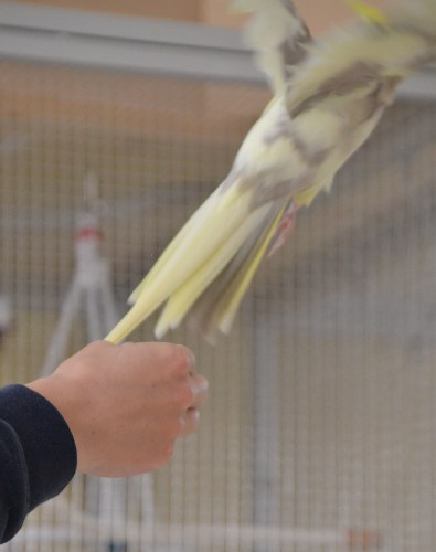 Die gibt es nur aus der Hand. Also kamen wir natürlich alle drei gleich aus der Voli raus. Janosch macht da immer den Anfang. Aber auch ich und Bella haben noch genügend abbekommen.Nach dem Frühstück habe ich mit Bella erst einmal die Wühlkiste unsicher gemacht, während Janosch akrobatische Flüge im Zimmer zurück legte. Dann haben wir zu dritt Flügelgymnastik betrieben (ja, auch Bella