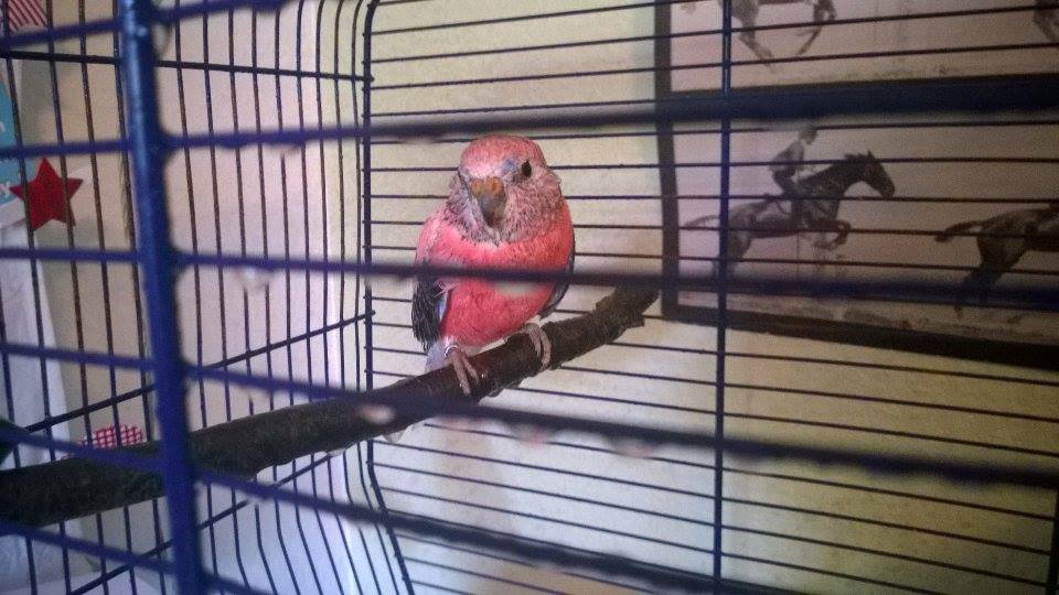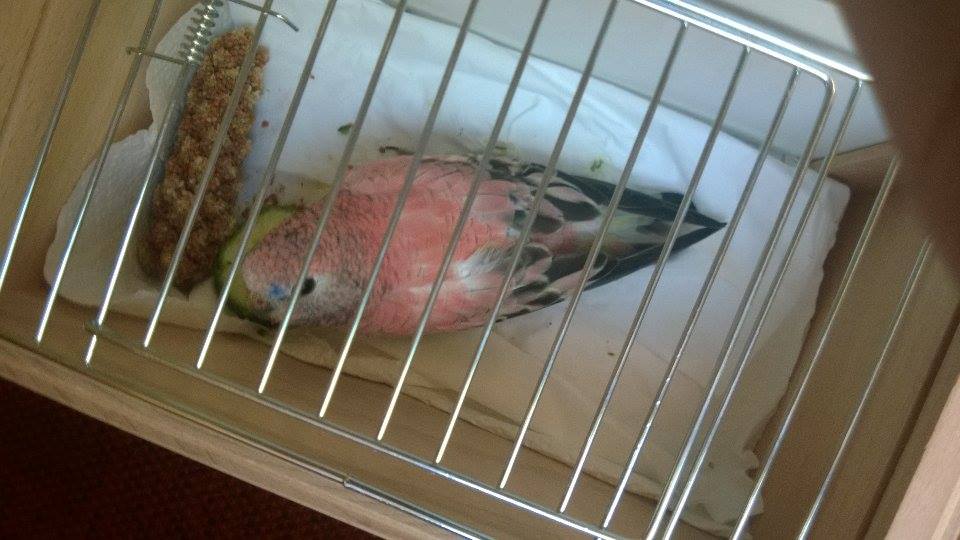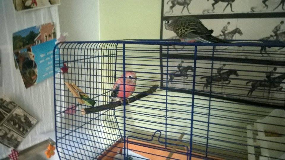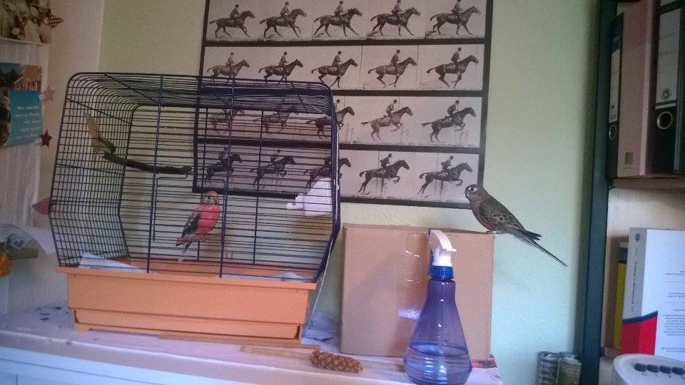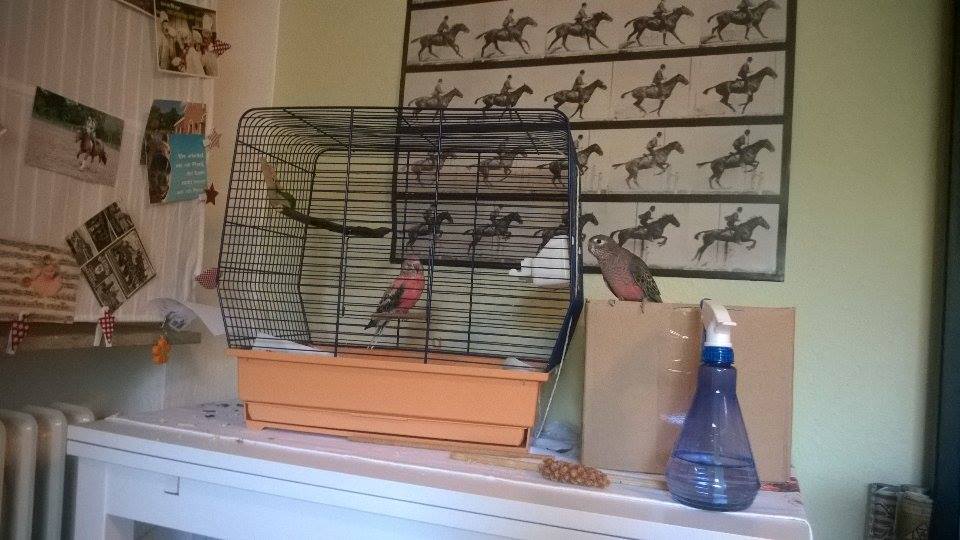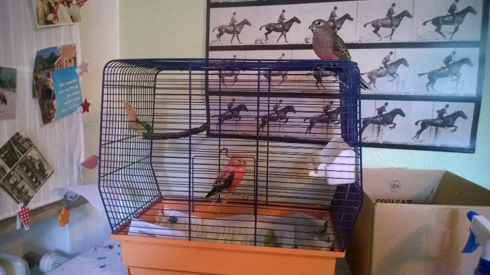 Als wir eben ankamen, hab ich den Hahn in meinen kleinen Käfig gepackt und ihn erstmal mit ein bisschen Wasser besprüht, weil es ja echt warm in der Kiste war und er das mag ![]()