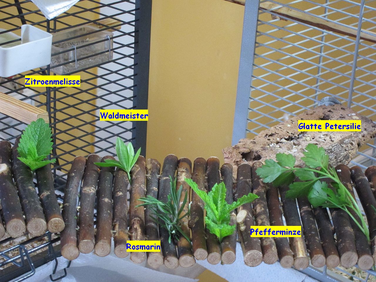 Da ja so einige Leute gemerkt haben, dass Wellis manchmal wie Hühner dort drin hängen, sollte auch etwas drin sein, was gut riecht (Wellis haben ein gutes Näschen) sind interessante Sachen wie kleine Mengen an Kräutern und Hölzern. :okay: