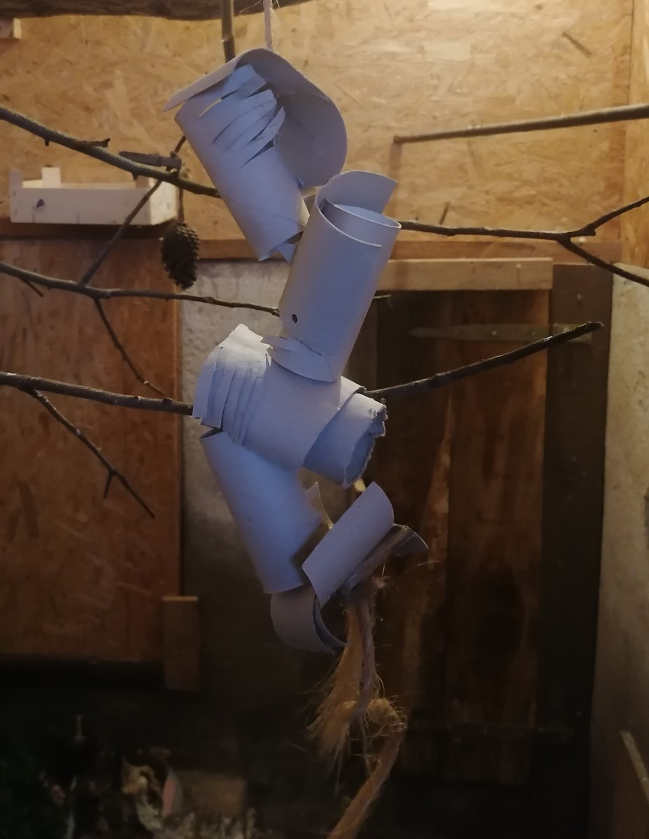 Klopapier Rolle ??auch cool. Ich hab meinen Flugbaum (Birnenbaumast) im Innen Bereich der Voliere mit einer Kette an die Decke gehängt. An der Kette kann man gut Sachen in die Kettenglieder hängen, die Vögel klettern auch dran. Das Beste ist aber, dass der ganze Baum schwingt, sich dreht und so immer anders im Raum hängt. Da müssen die drauf sitzenden Vögel echt das Gleichgewicht halten, weil durch das ständige Anfliegen alles in Bewegung ist. Auch das Anfliegen und durchfliegen wird dabei zur Akrobatik...