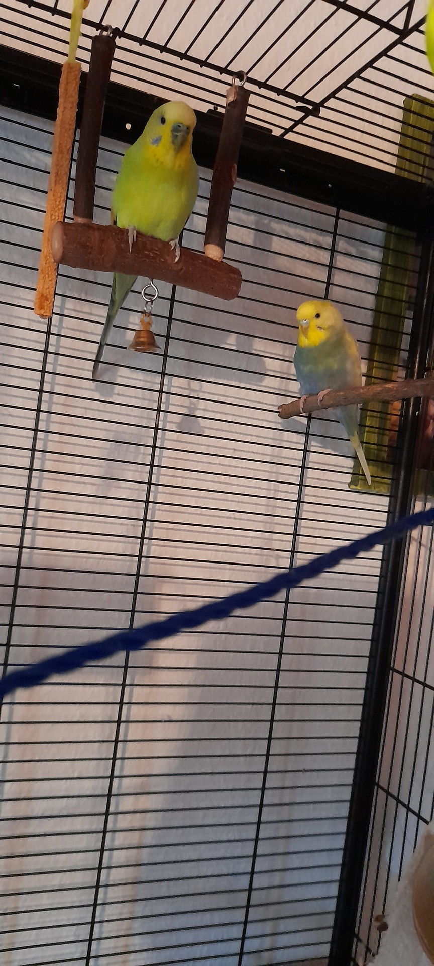 Freiflug bekommen sie fast den ganzen Tag, wobei es in einer Zweizimmerwohnung mit einer Fünfjährigen, die gerade Inlineskates bekommen hat und draußen wegen des Wetters nicht fahren kann, im Moment etwas eingeschränkt ist. Jetzt ist halt Zeitweise Freiflug und die Wohnzimmertüren sind zu. Und wenn die beiden zum Futtern in den Käfig gehen, ist für ein, zwei Stunden "Freifahrt" für Sandra. Leni schaut da immer sehr gespannt zu, wirkt manchmal, als würde sie das am liebsten auch können. Insgesamt tobt sie gerne mit Sandra, wobei Sandra dann aufs Sofa hüpft oder Handstand übt oder ähnliches und Leni dann wild umherfliegt, auf ihrer LIeblingsleiter klettert oder anderweitig turnt.