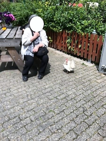 Gestern starteten wir - meine Schwester, unsere Mutter und ich - einen Ausflug zu einem nahe gelegenen Park, in dem Wildtiere gehalten werden, u. a. Ziegen, Schafe, Gänse, Truthähne, Hühner, Hasen, aber auch Kanarienvögel und seltene Sonnensittiche. Irgendwie mochte mich ein Huhn besonders, jedenfalls lief es hinter mir her und setzte sich einige Zeit zu uns, putzte sich munter und genoss die wärmende Sonne. Leider kamen dann eine junge Mutter und Großmutter, die ihren noch sehr kleinen Jungen die Tiere scheuchen ließen. Da war es vorbei mit der friedlichen, trauten Gemeinsamkeit.