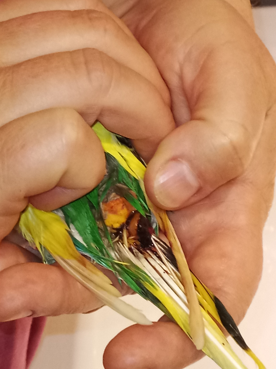 Gestern war ein schlimmer Tag, wir sind mit dem Smartie (er ist der Mann von Safira); 4 Jahre jung ist Smartie und er hat einen Tumor oberhalb der Bürzeldrüse auf der Rückenplatte. Leider ist er der Vogel, der es sich nicht hat anmerken lassen und es haben die Federlosen erst gemerkt als die Federn hoch standen.