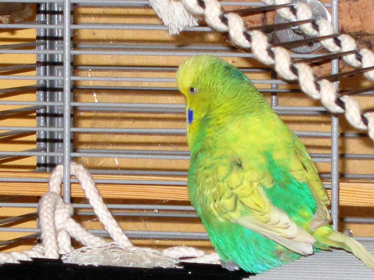 Die beiden ältesten Wellis Bonnie und Leopold gesellen sich meist später dazu, wobei das bei Leopold nur noch sporadisch der Fall ist. Gesagt - getan, Bonnie ist raus und lässt sich von Rübe gerade kraulen.