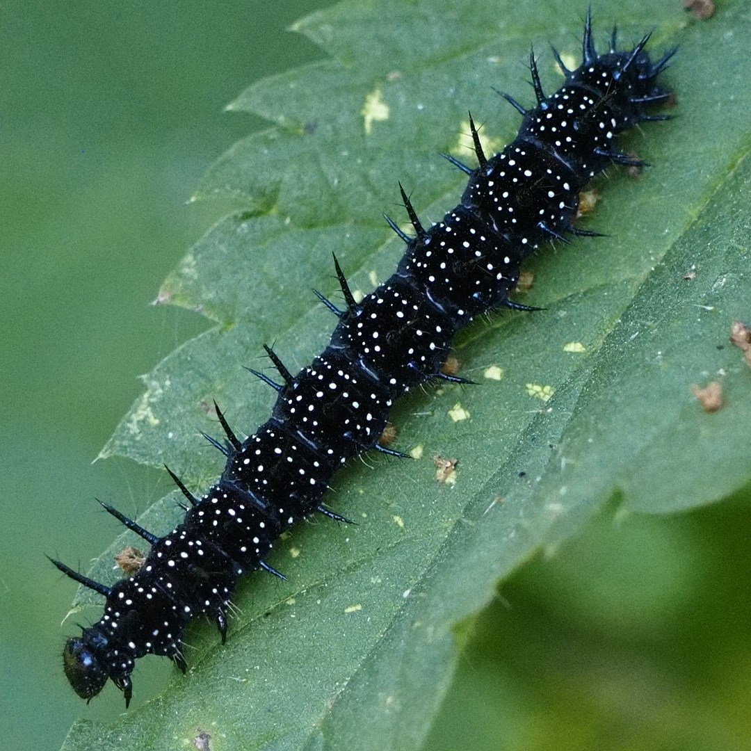 Ein Gewusel von Tagpfauenaugen-Raupen. Sie bleiben immer zusammen, häuten sich auch zusammen in einem Pulk. Wenn sie größer geworden sind, vereinzeln sie sich teils, jeder geht seinen Weg und frisst. Raupe Nimmersatt halt. :)