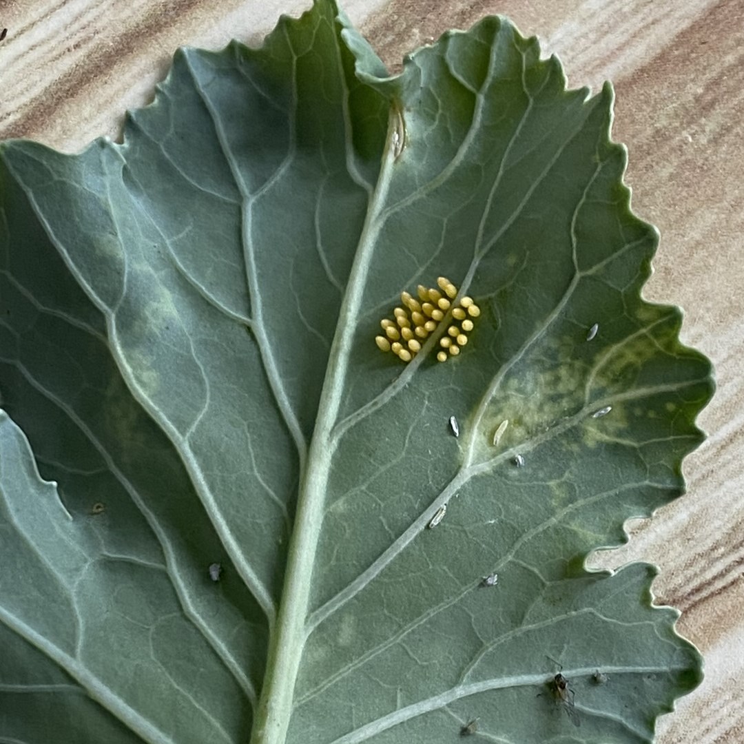 Vorgestern wollte ich einen Kohlrabi aus dem Garten holen, da sah ich an der Unterseite des Blatts gelbe Punkte.