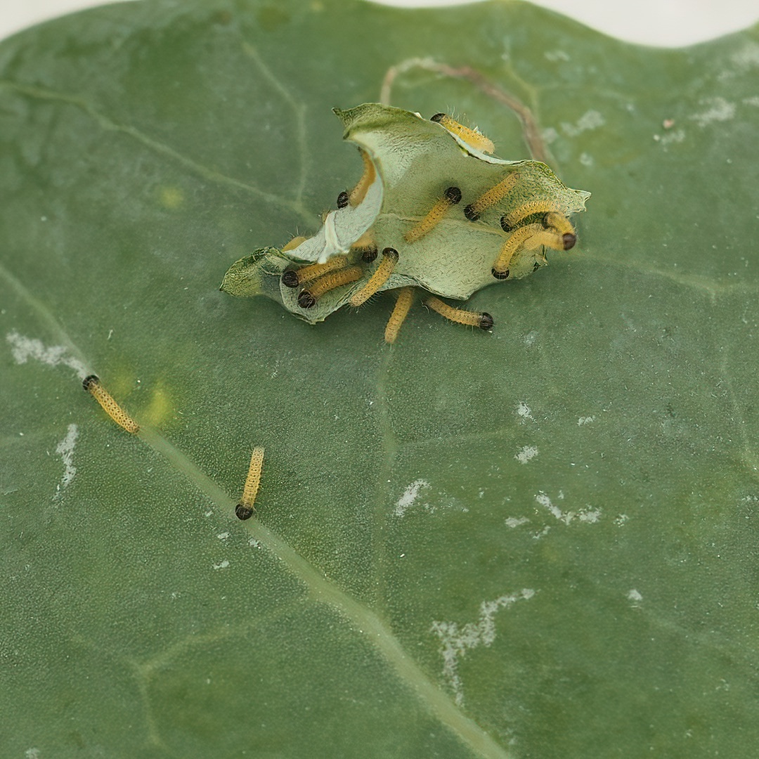 Nach zwei Tagen scheinen die Raupen geschlüpft zu sein. Sie sind immer noch winzig klein ca. 2mm groß, man braucht echt eine Brille, wenn nicht sogar ein Vergrößerungsglas, um die kleinen Tierchen zu sehen. Sie haben schwarze Köpfe und einen gelben Leib und bewegen sich kaum.