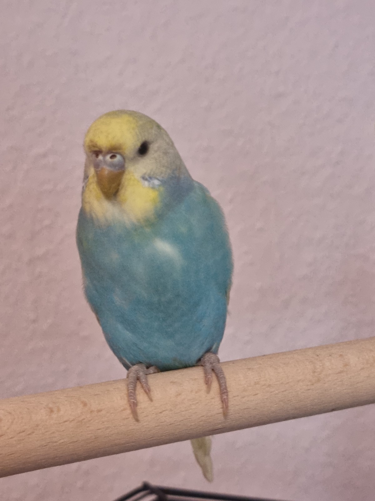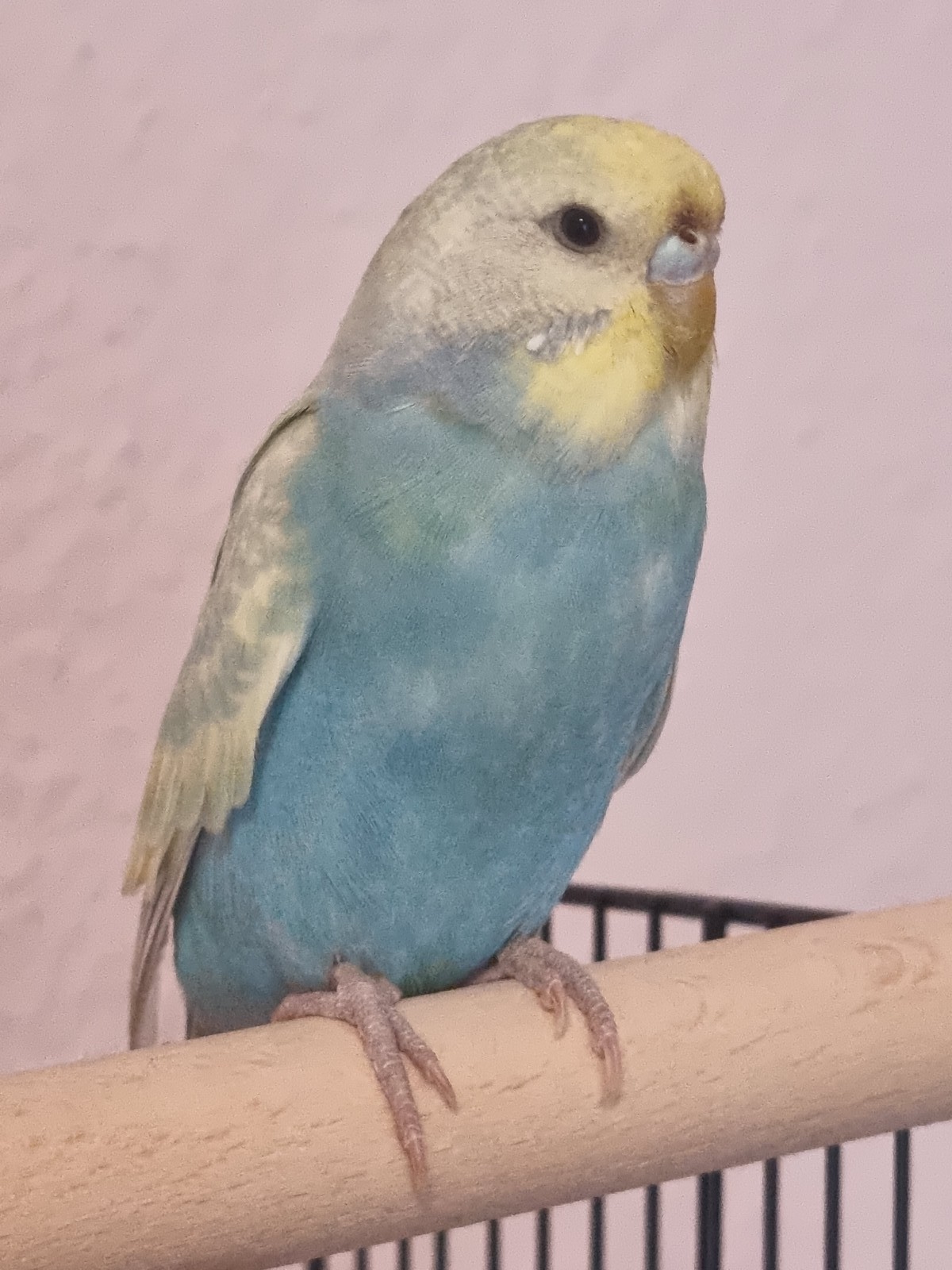 Toutu ist gelb/ türkisfarben, ohne Flecken. Kitti ist die, der, mit Flecken unter dem Schnabel. Sie müssten jetzt 3 oder 4 Monate alt sein. Wir haben sie beim Züchter gekauft.