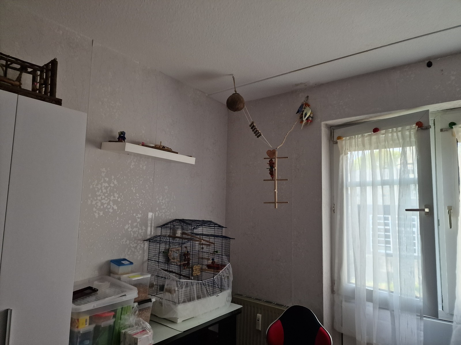 Und so sieht es im Zimmer aus. Den Spielplatz links oben auf dem Schrank haben sie noch nicht entdeckt, zwar lassen sie sich mit dem Finger dahin führen, alleine fliegen sie, trotz Hirse, aber noch nicht hin.