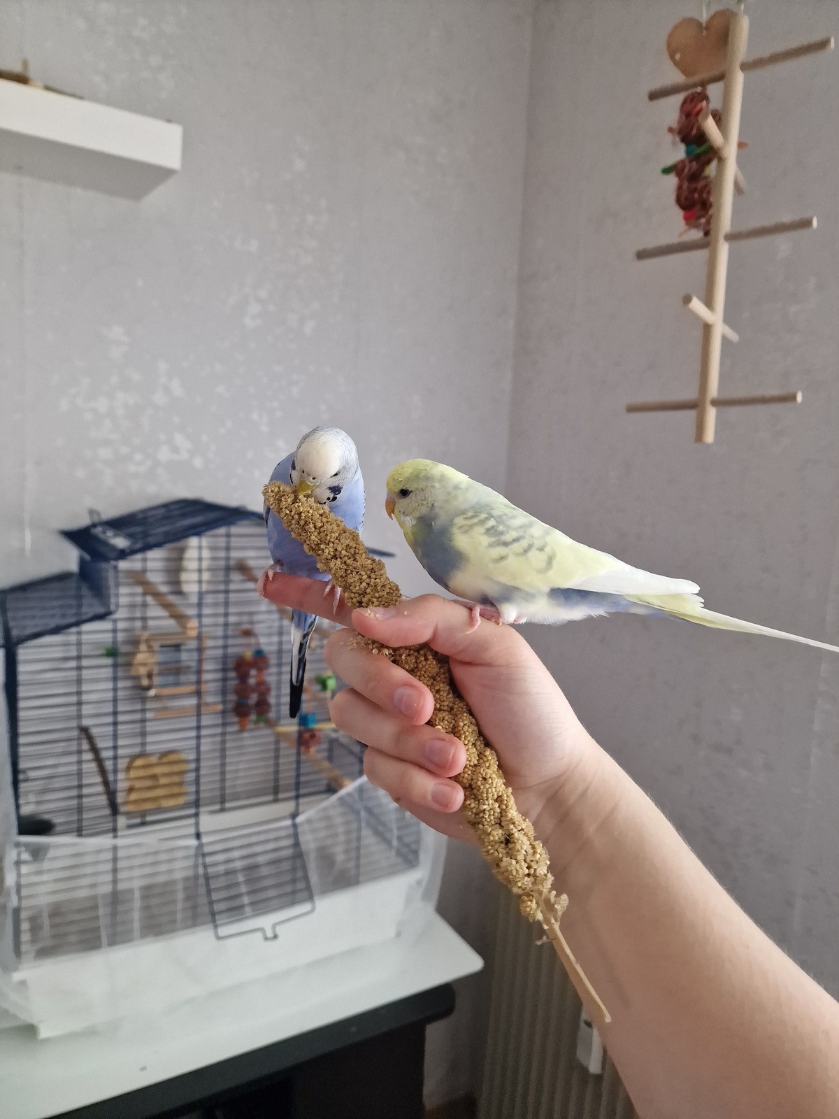 Heute kam Blue auf meinen Finger für Kolben Hirse und hat sich erst mal satt gefressen ?, sie blieb das erste Mal so lange auf meinem Finger. Daraufhin kam Talya auch das erste mal von der Brücke auf meine Hand geflogen? bin soo happy.