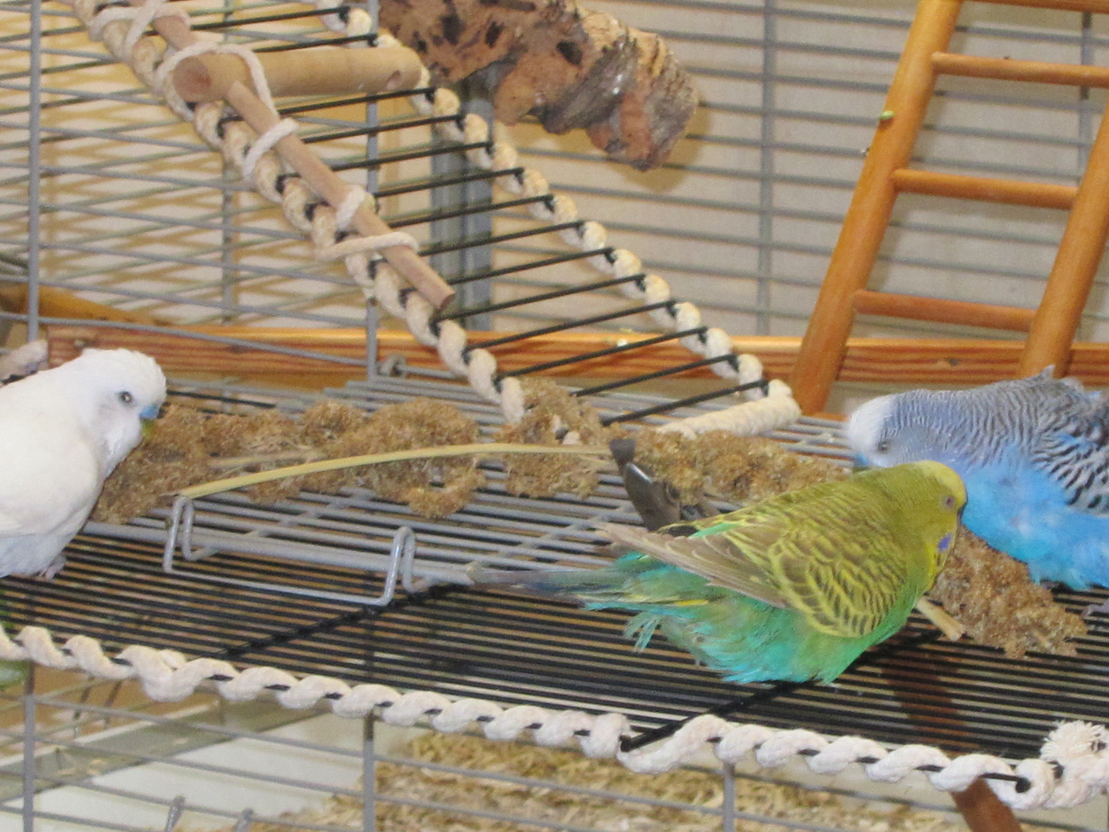 Hallo, wir sind hier der Joshi in Blau und die Lisa in grünem Outfit, mit dem Seil und dickeren Stangen, damit die Krallen und Ballengeschwüre erstmal wieder sich zurückbilden.