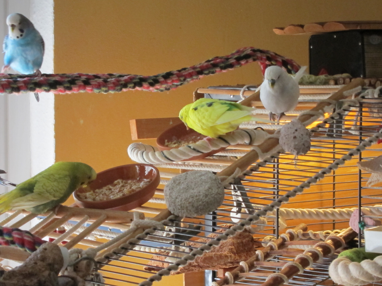 Auch die schöne Seilspirale, sie ist den Frischlingen zwar sehr ans Herz gewachsen, jedoch auch ein schöner Platz zum Hängenbleiben mit den Krallen, die ja auch ständig geschnitten werden müssen. Der Schnabel und die Fußnägel macht dann der Federlose, er kann das ganz gut und wir brauchen nicht zur Fummeltante. ![]()