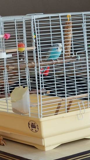 Unsere Menschen stellen dann den Käfig auf den Boden und Fienchen kann hineinhüpfen. Ich fliege lieber auf die Stange, wenn meine Menschen das Zimmer betreten. Ich traue Ihnen noch nicht so richtig, obwohl Sie sehr nett zu uns sind.