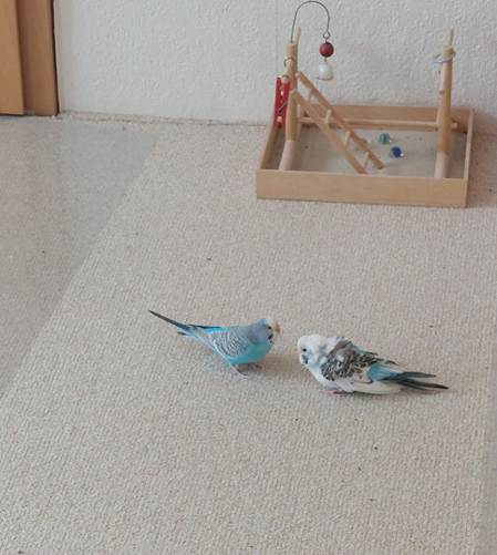 Nach einer ruhigen Nacht im separaten Käfig habe ich etwas gefuttert und dann wurden unsere beiden Käfige geöffnet. Fienchen hat gepiepst und geschnattert. Ich habe dann ganz vorsichtig zurück gepiepst.