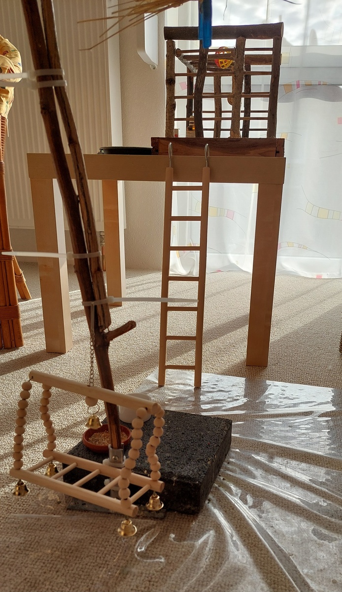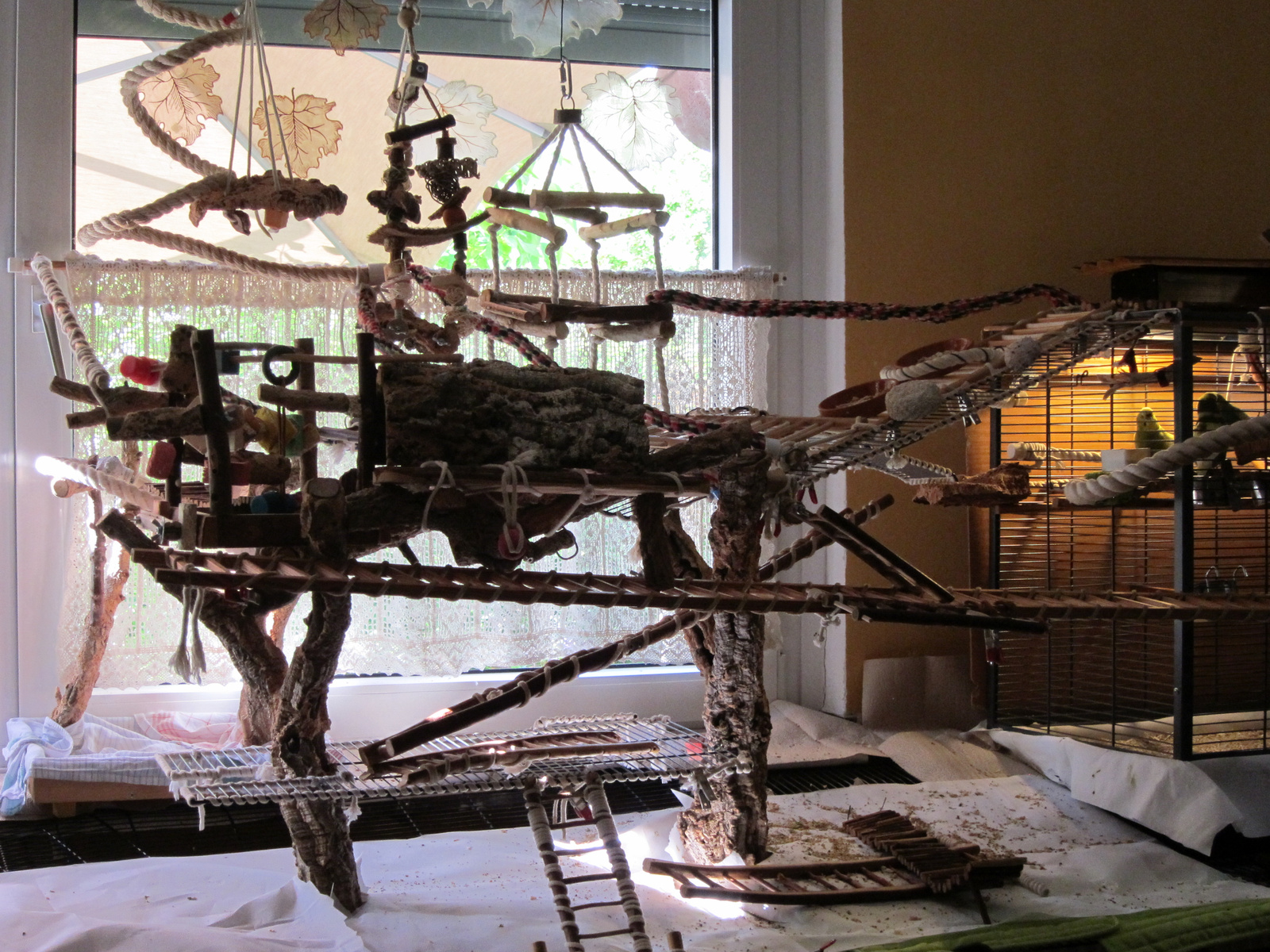 Dann habe ich all meinen Mut zusammengenommen und bin aus dem Käfig. Erstmal das Zimmer erkunden und auf eine der vielen Stangen fliegen. Ich war ganz schön aus der Puste.