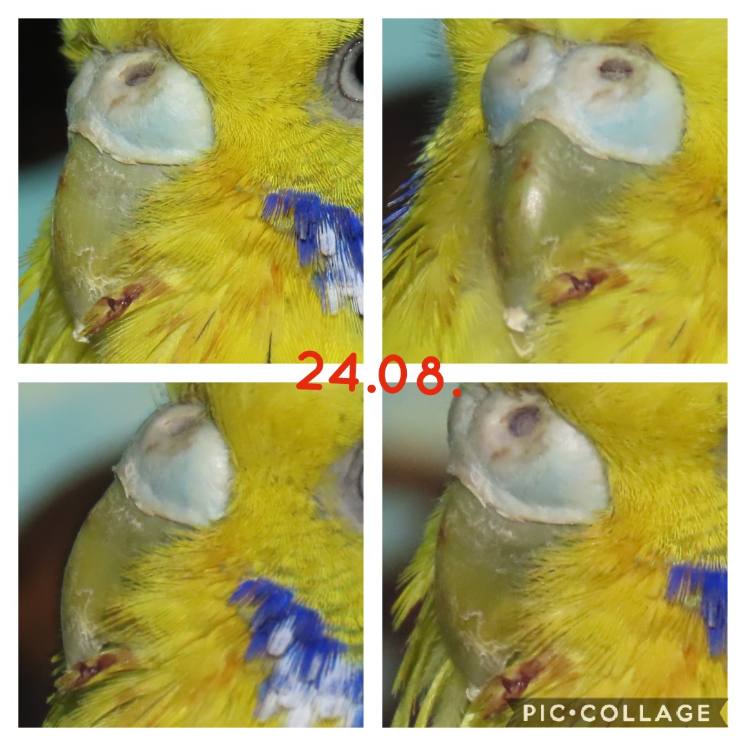 Mittlerweile ist der weiße Fleck am Schnabel komplett weg, aber der Bereich um die Kloake sieht immer noch unschön aus, wobei schon länger nichts mehr dran hängen geblieben ist.