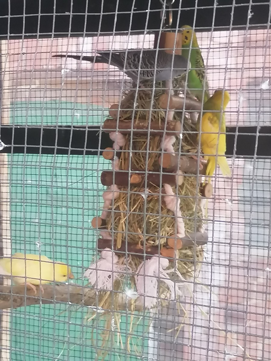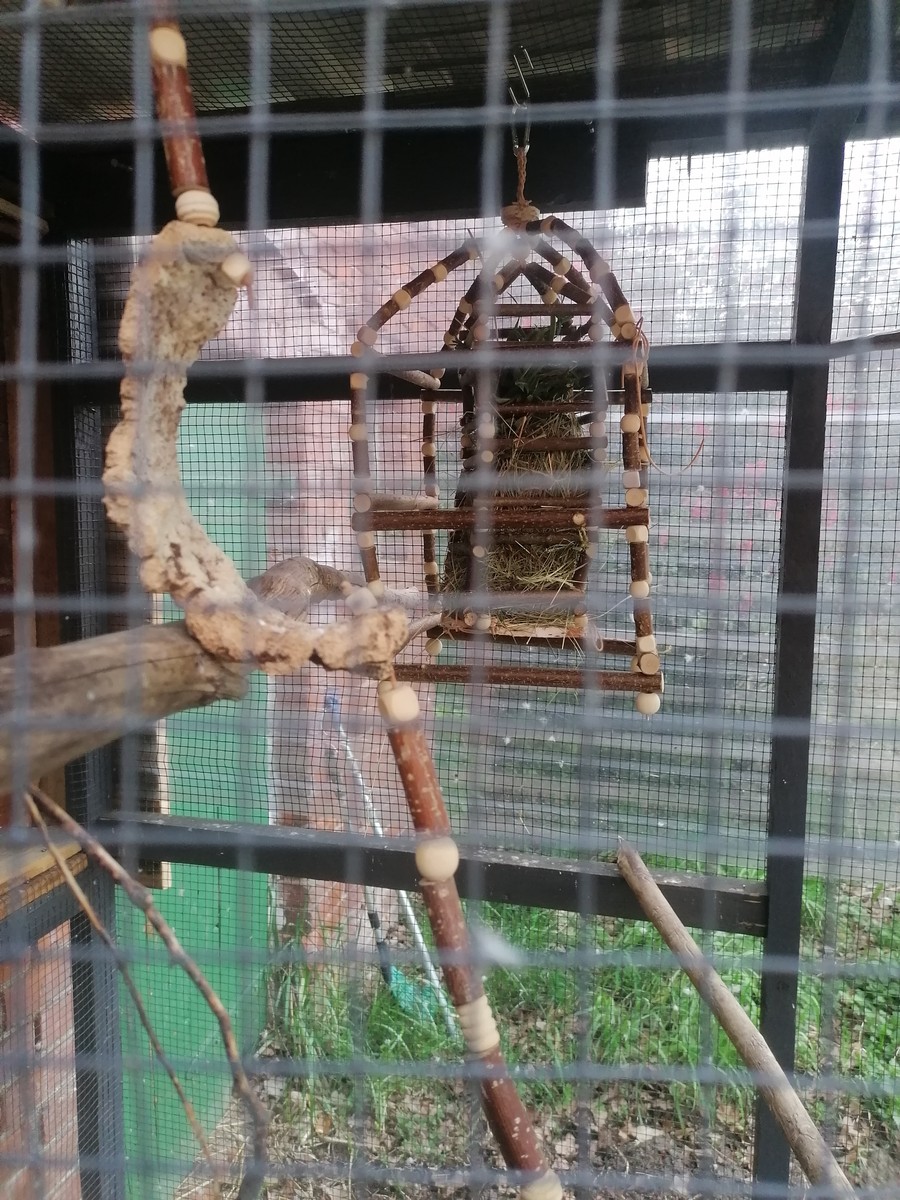 Neue Heu und Grünfutterraufe in die Voliere gehängt - immer wal Neues??
