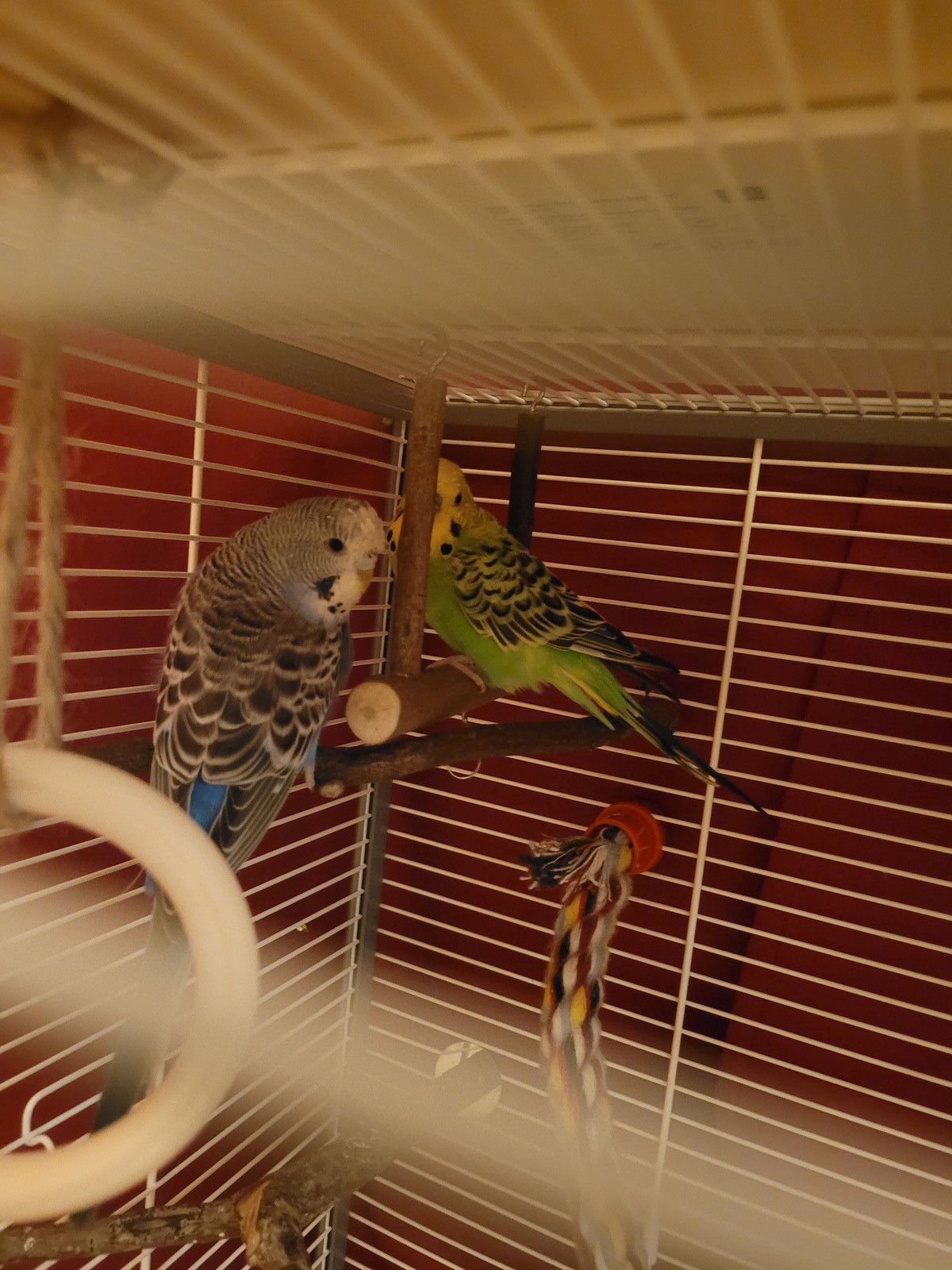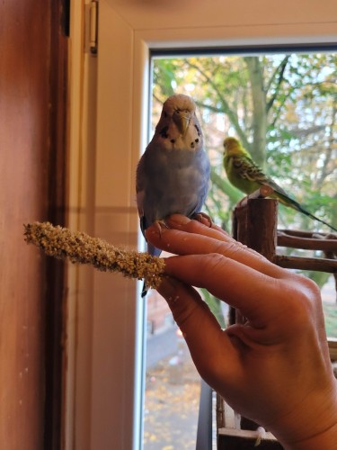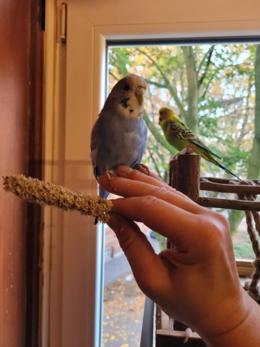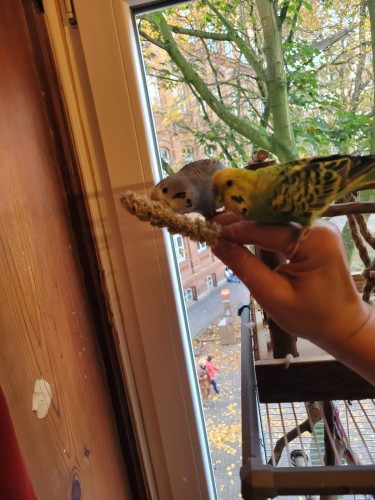 Haben natürlich im Käfig immer Zugang zu ihrem Futter. Als passe ich ab, wenn sie auf dem Weg sind. Fliegen zuerst auf ihren"Spielplatz" , tüddeln da ein bisschen rum bevor sie reingehen zum fressen. Dann sind die beiden sehr offen für ein kleines Leckerli