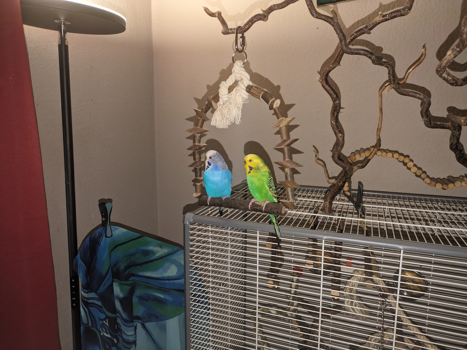 Hier die beiden Mädels bei einer "Wir- schlafen- heute- draussen" Party. Links Douggie, rechts Holly. Manchmal wollen die kleinen Süssies einfach nicht reingehen. Dann wird das Licht natürlich runtergedimmt angelassen. ( Die Lampe ist selbstredend LED und strahlt keine Wärme ab). Die Jungs haben draussen auf dem Fensterast genächtigt. Wenn sie draussen schlafen wollen, geht auch wirklich keiner rein.