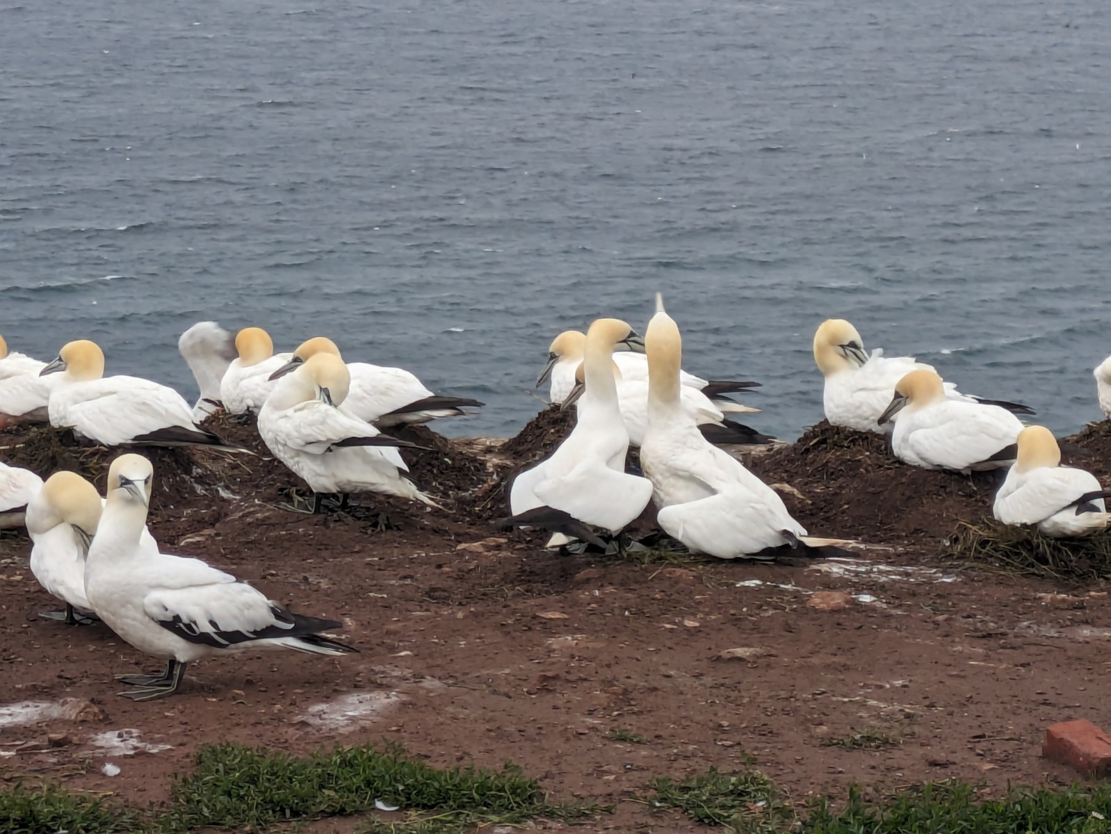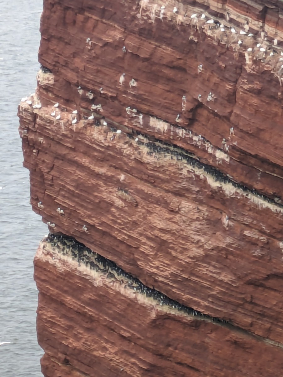 Das ist auf der "langen Anna". Die hellen Vögel sind drei-Zehen Möwen, die schwarzen in den Spalten sind Trottellummen. Diese Arten brüten nur auf den steilen Felsküsten.