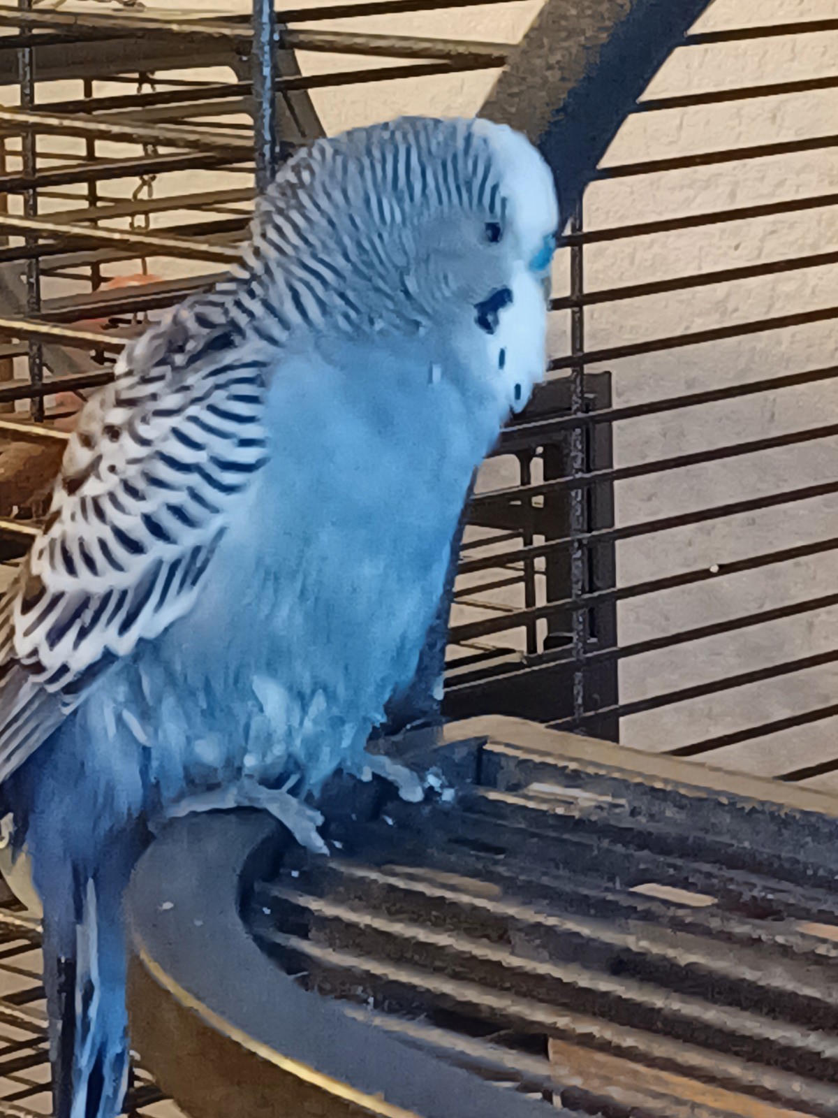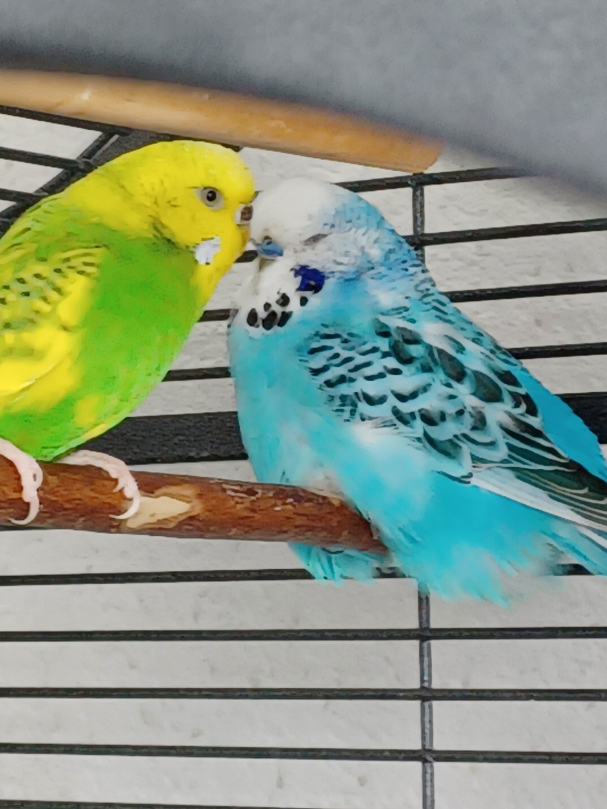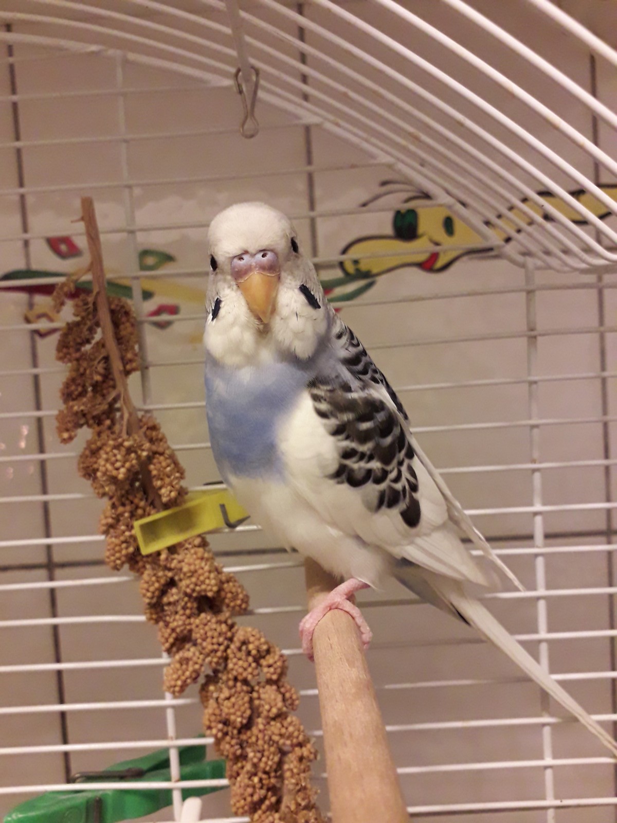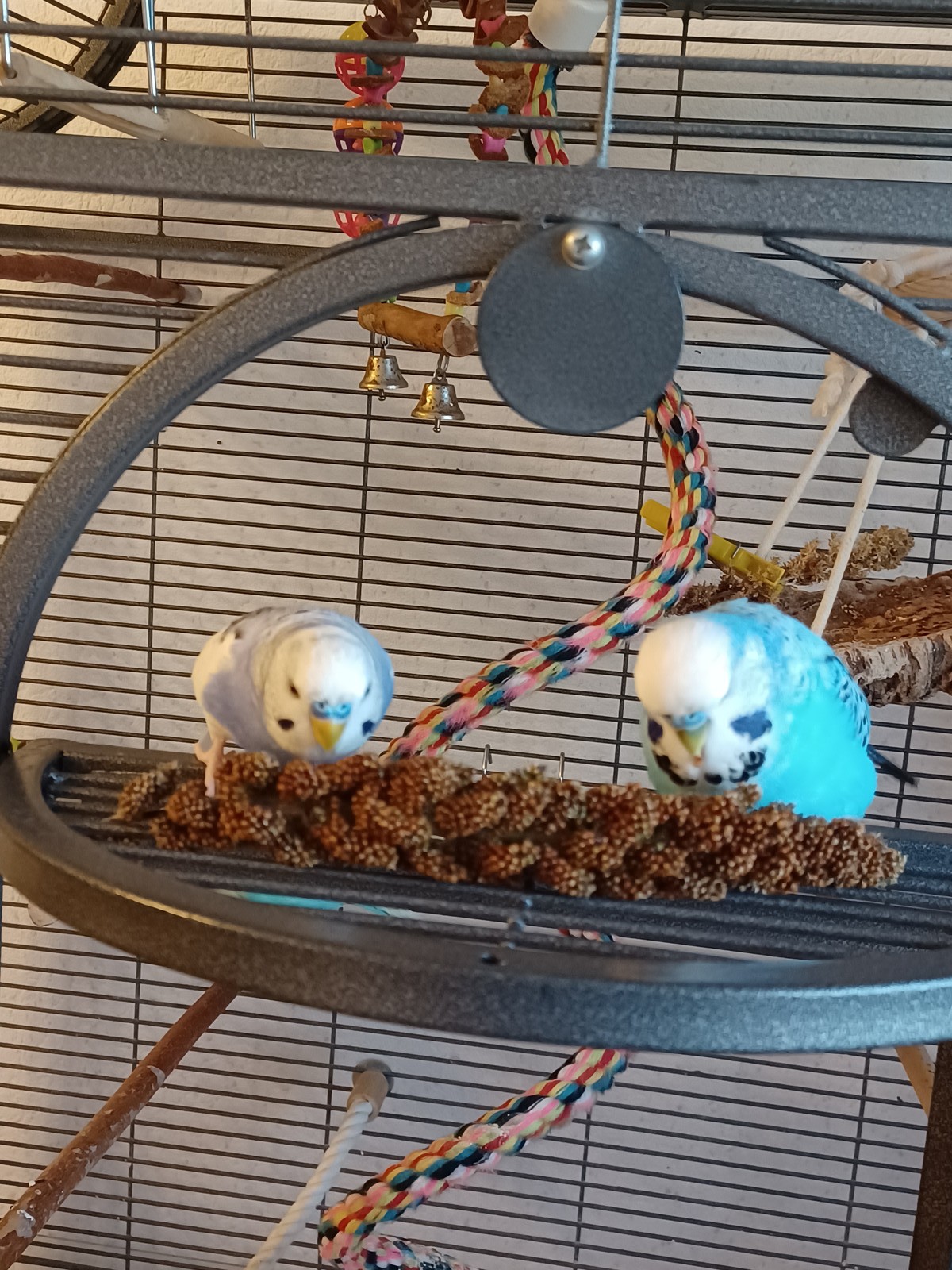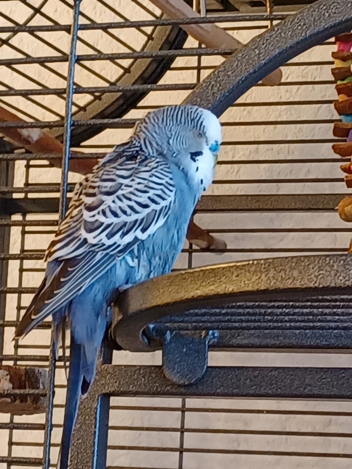 Wir hielten ihn zunächst in unserem kleinen Krankenkäfig in Quarantäne, bis wir einen Termin beim Vogelkundigen hatten. Wir ließen ihn eingehend auf Bakterien, Pilze und Parasiten untersuchen. Alles in Ordnung. Nun sitzt er zusammen mit Freddie und Lenny in einer der beiden Volis.